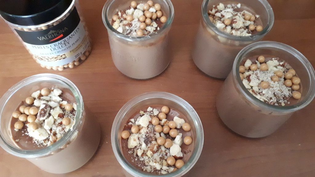 - Au moment de servir, ajouter le restant des noisettes concassées, disposer des billes craquantes dulcey ( Valrhona)