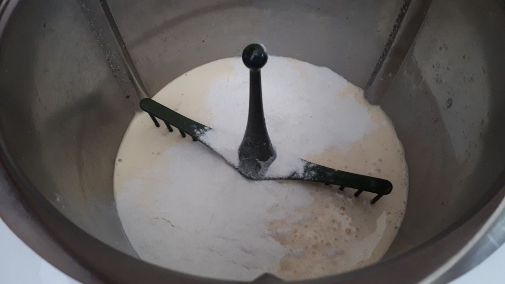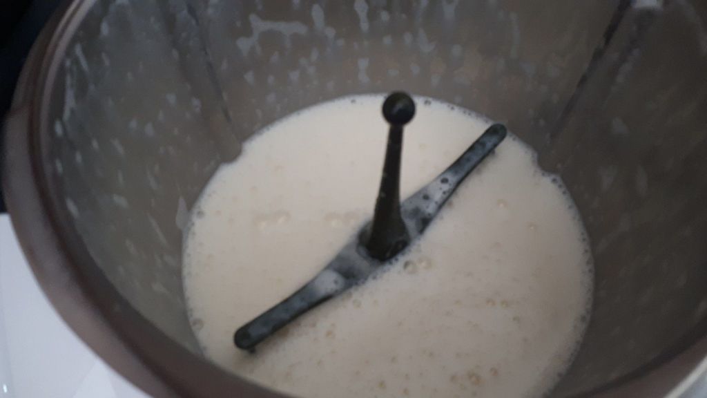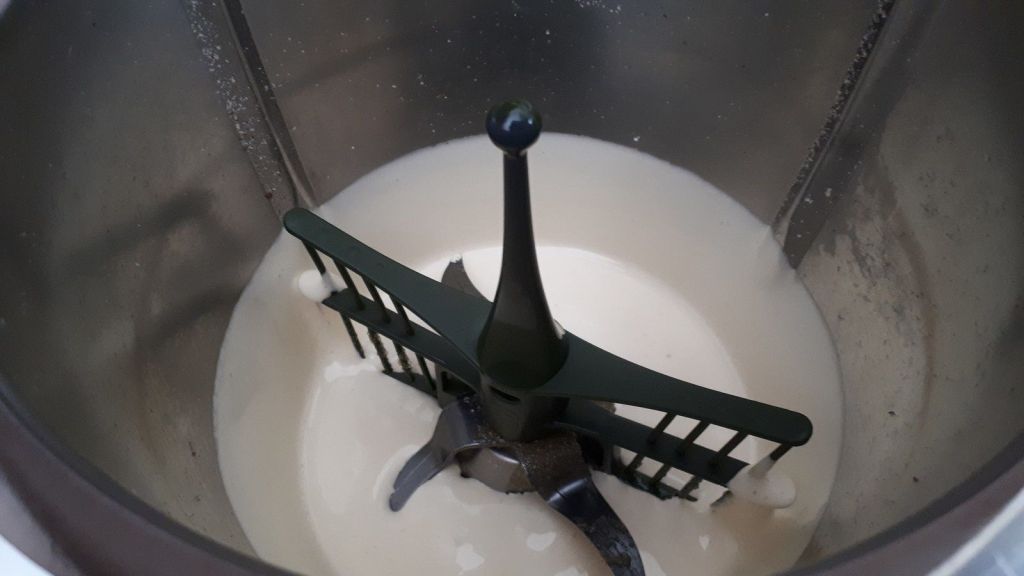 - Insérer le fouet puis mettre vos jaunes d’oeufs et le sucre fouetter 2min/vit3, ajouter le lait, la crème de riz et faire chauffer 8min/85°C/vit3.