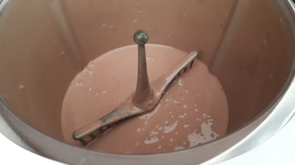 - Ajouter le chocolat et la moitié des noisettes concassées puis faire fondre 2min/50°C/Vit3.