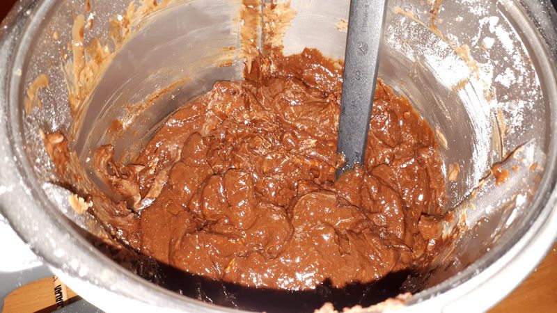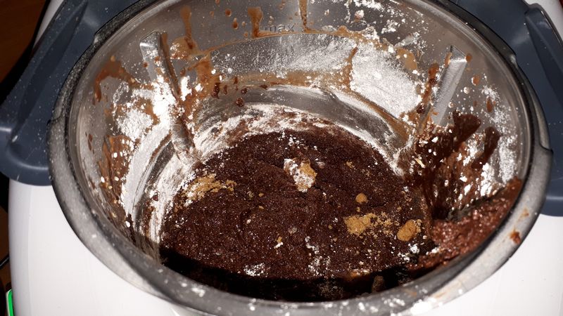 2. Mettre dans le bol, le beurre coupé en morceaux et les pistoles de chocolat puis faire chauffer 5min/50°C/vit2, racler les bords, ajouter le sucre et la farine mélanger 20sec/vit3.