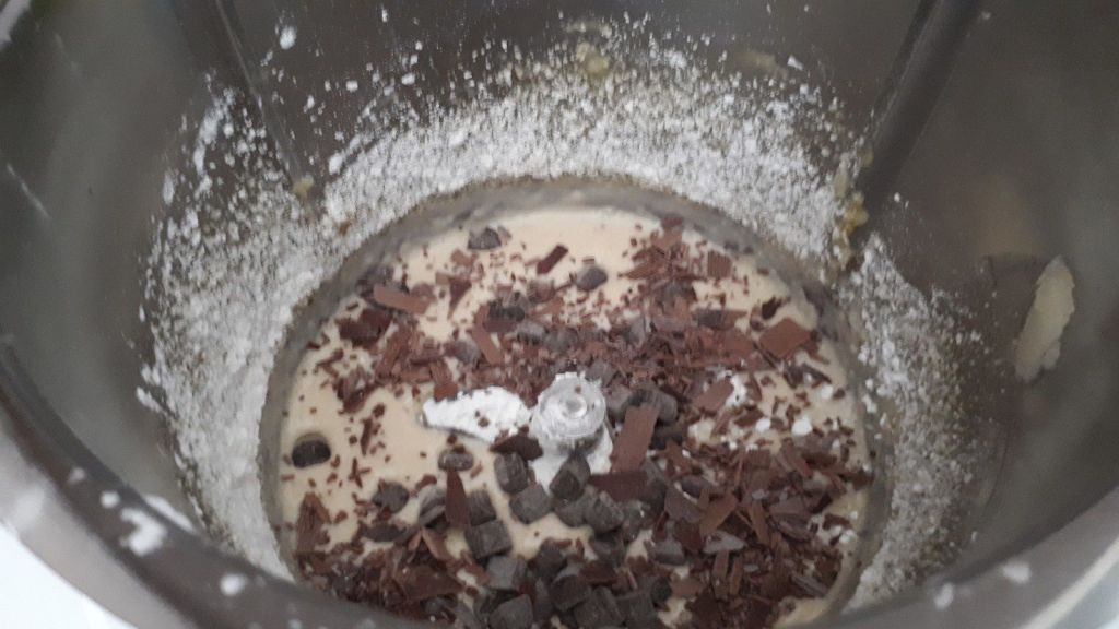 - Terminer par incorporer les chunks de chocolat et les copeaux puis mélanger 20sec/couteau inversé/Vit3.