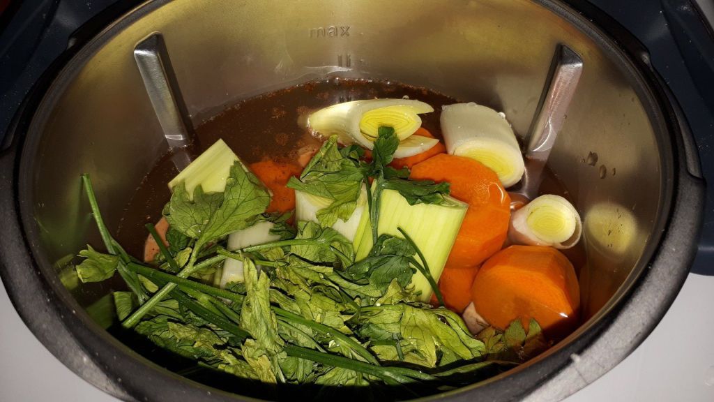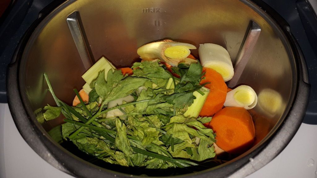 - Éplucher, laver vos légumes, (carottes, patate douce, poireau) les couper en rondelles; les mettre dans le bol avec le persil, (sans les grosses tiges), le gingembre, le cumin et l’eau puis faire chauffer 20min/varoma/Vit mijotage.