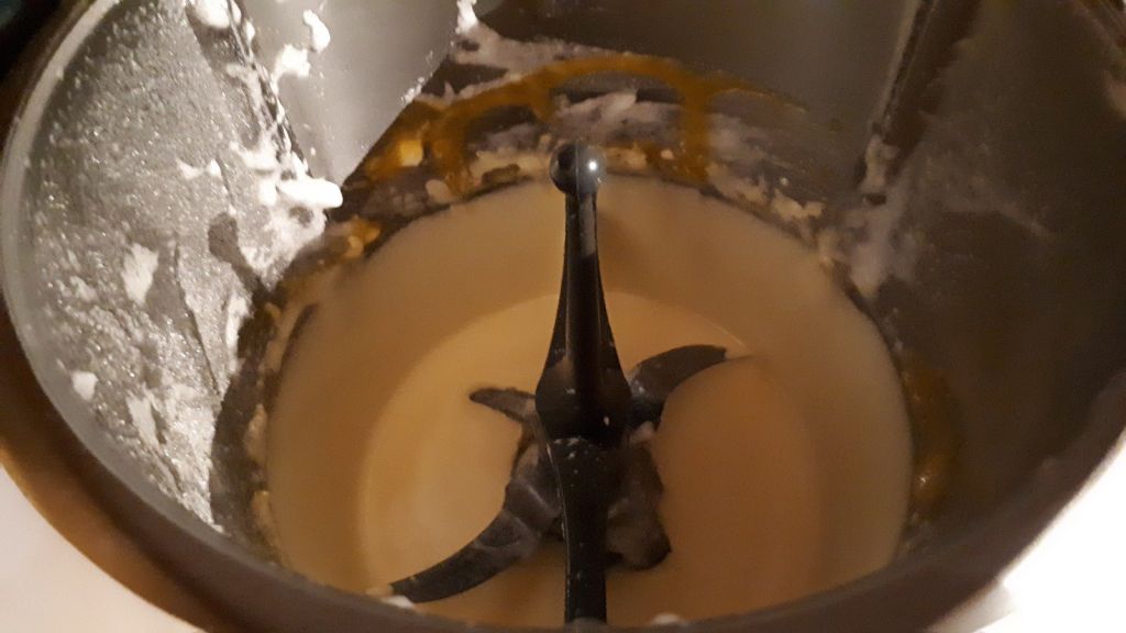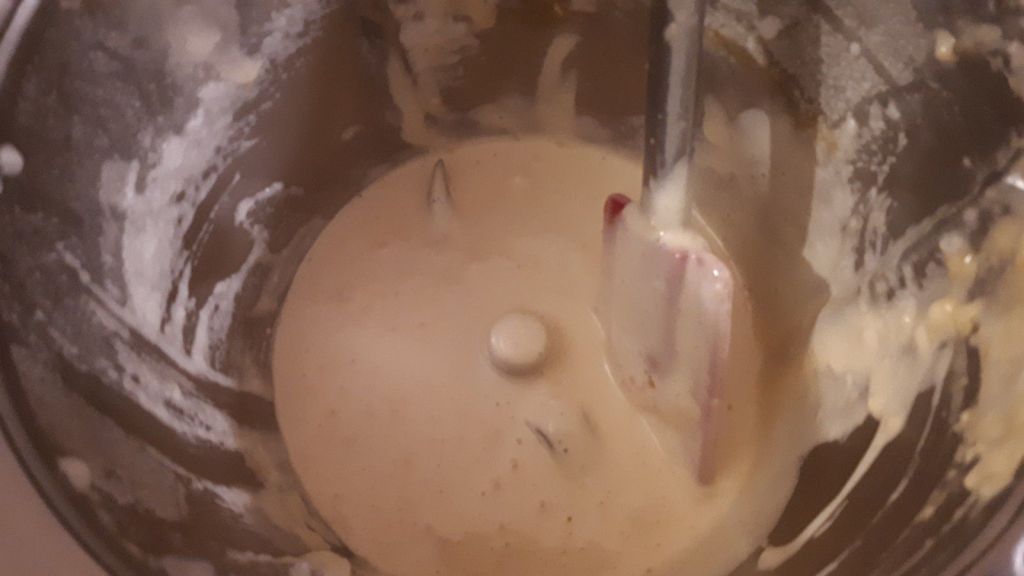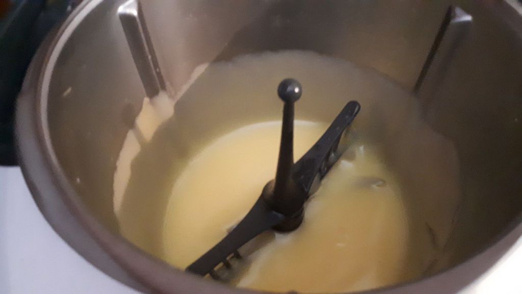 - Inutile de rincer le bol, mettre le jaune avec la sucre et le fouet puis mélanger 2min/vit3, enlever le fouet, puis verser la farine par le trou du couvercle pendant 1min/vit3, ajouter le blanc et continuer le mélange 1min/vit3.