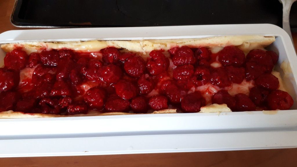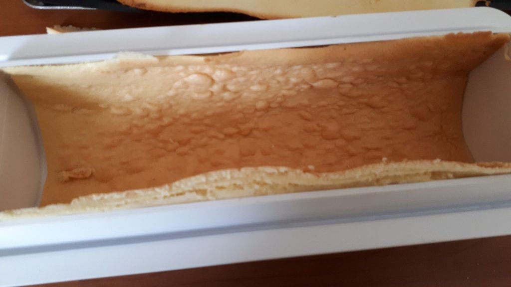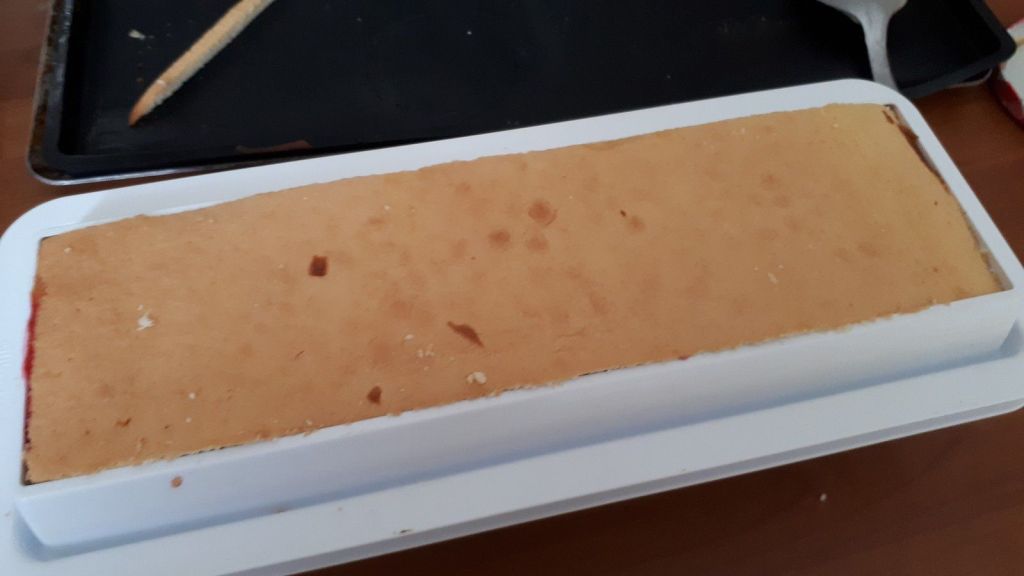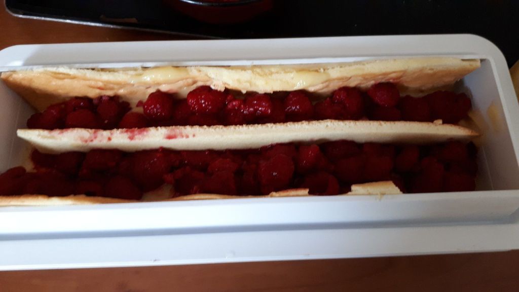 - Découper la génoise le long du tapis relief. Placer celui-ci dans le moule à bûche, génoise visible ( voir photo). Imbiber avec modération, à l’aide d’un pinceau de silicone de cuisine, la génoise de sirop. Garnir de la moitié du lemon curd et de la moitié de la quantité de framboises. Mettre une bande de génoise au milieu puis placer une autre bande de génoise au dessus. Imbiber de sirop. Par-dessus, mettre du lemon curd et des framboises (en garder quelques-unes pour le décor). Terminer par la dernière bande de génoise préalablement imbibée de sirop (pas trop). Mettre au réfrigérateur.