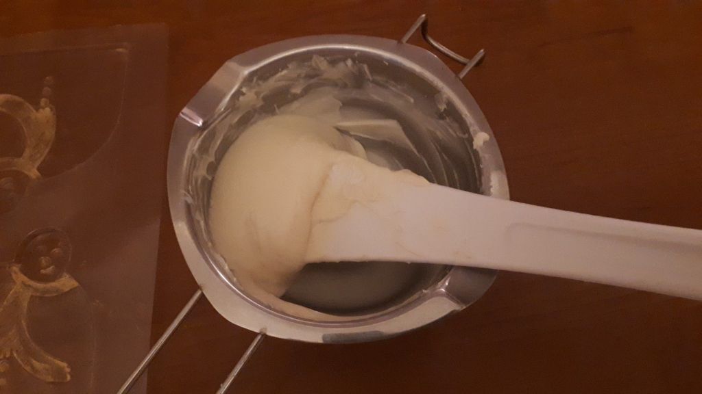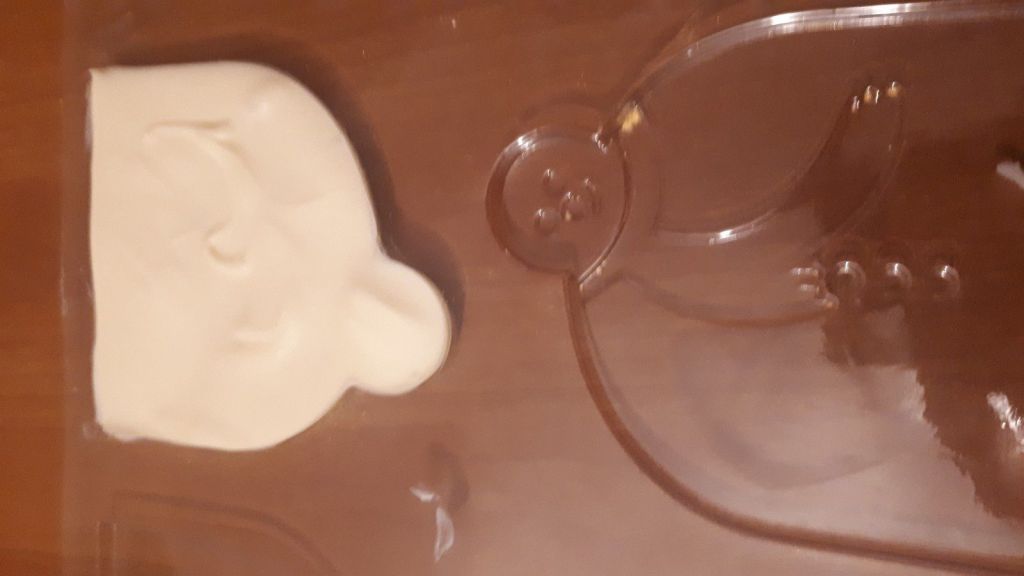 - Quand la couverture est à température idéale 29-30°C couler le chocolat blanc dans les empreintes.