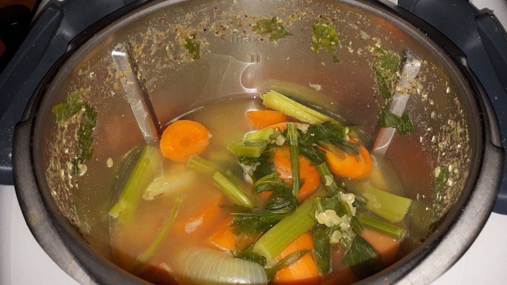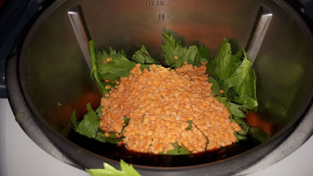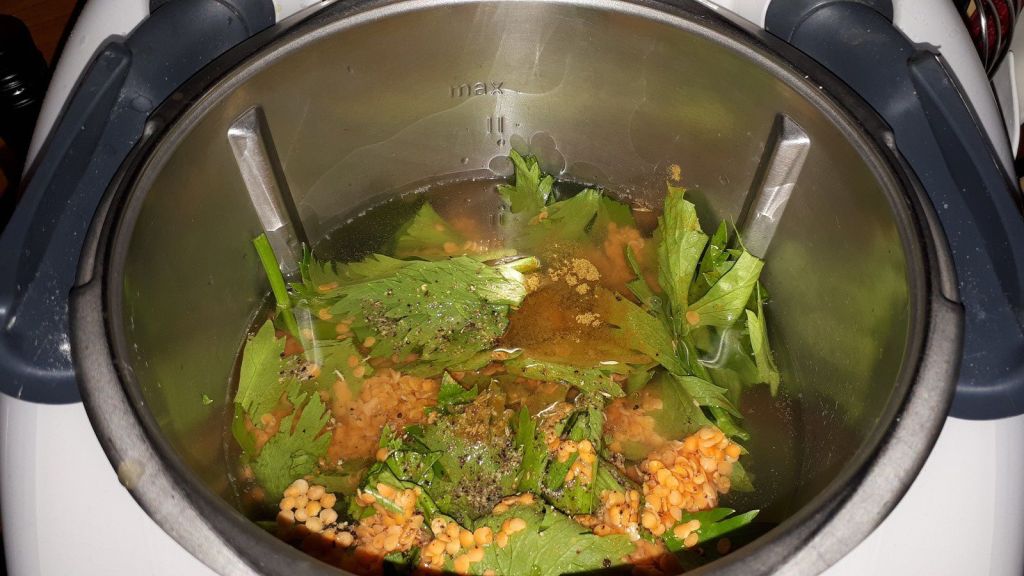 - Mettre les légumes dans le bol avec les lentilles, ajouter l’eau, le cumin, le sel, le poivre et faire chauffer 20min/varoma/vitmijotage.