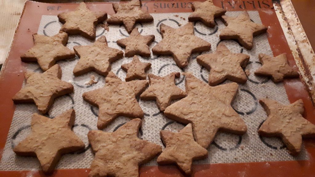 - Découper à l’aide d’emporte-pièces ( j’ai choisi des étoiles Metaltex) des biscuits, les déposer sur une plaque de cuisson recouverte d’une toile silpat.