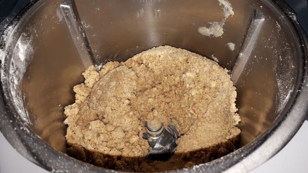 - Ajouter les farines, la levure, le sucre, le sel, la cannelle et le beurre coupé en morceaux puis mixer 30sec/vit4, ajouter l’œuf et le jaune, le zeste du citron et mixer 15sec/vit4.