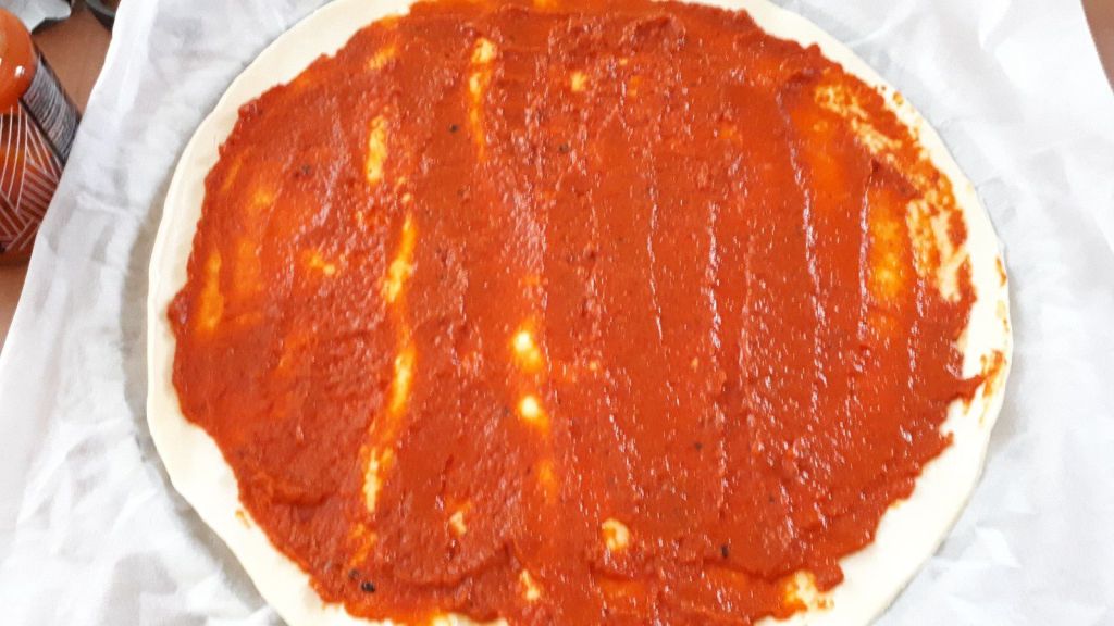 - Étaler le premier disque de pâte sur un papier cuisson, badigeonner l’ensemble avec la crème, la couche ne doit pas être trop épaisse, j’ai utilisé environ la moitié de mon pot de crème.