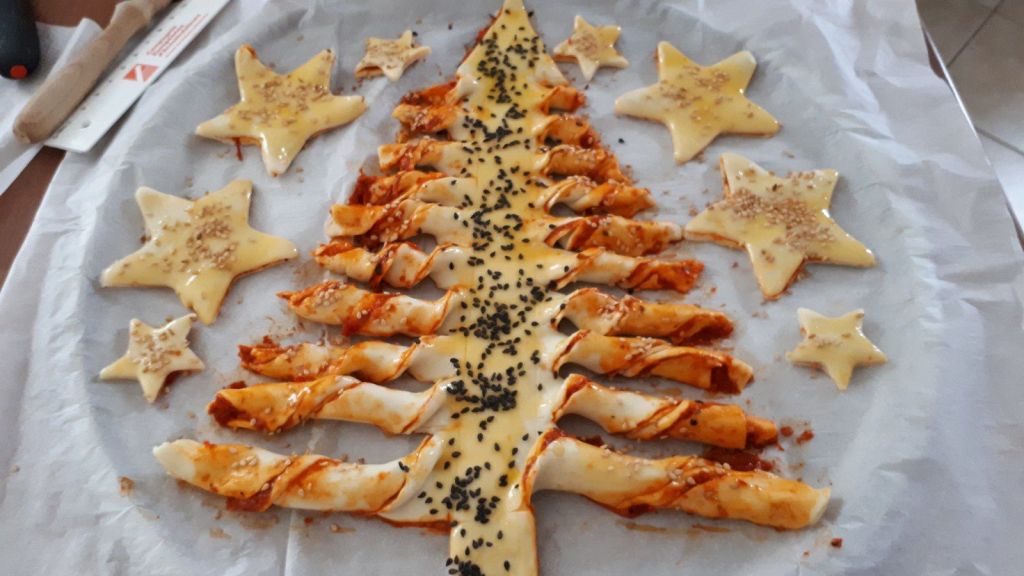 Je vous avais déjà publié une recette de sapin pour l’apéritif avec du pesto et une sauce à l’aubergine..J’ai voulu en faire un nouveau avec la bonne crème que j’avais reçu de l’épicerie Grecque Pantopoleio. Avec cette crème le soleil peut s’installer à notre table de Noël.