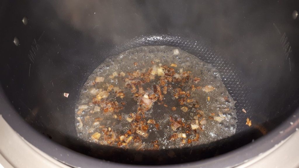 - Mettre l’huile d’olive dans la cuve et l’échalote dès le préchauffage du mode dorer, remuer, lorsque le préchauffage est terminé ajouter le vin blanc et laisser dorer environ 3 minutes jusqu’à évaporation presque complète du vin.