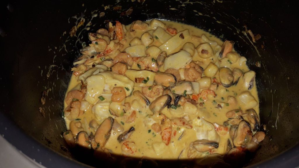 - Ajouter le cocktail de fruits de mer, la crème fraiche, le curry, le curcuma, une cuillère à soupe de ciboulette ciselée , assaisonner et passer en mode mijotage puis laisser environ 8 minutes. Mélanger régulièrement.