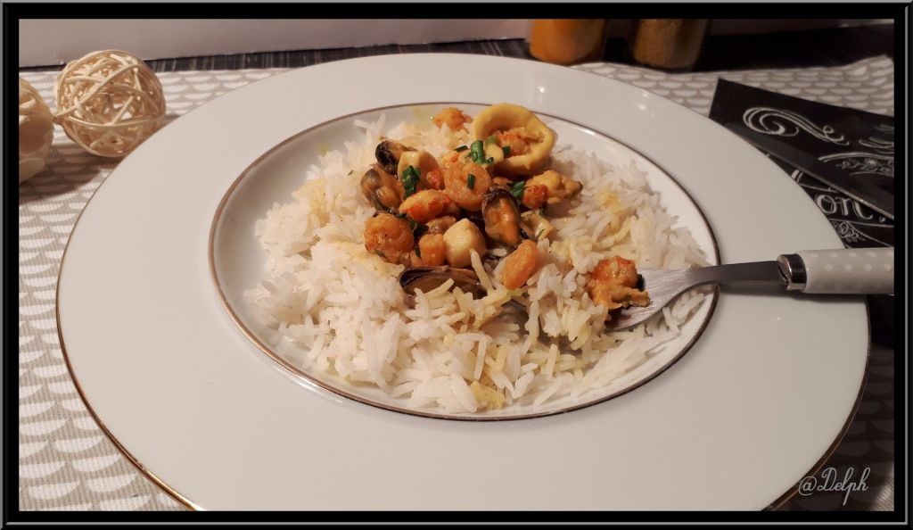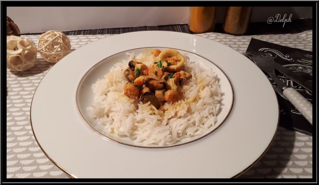 Voici une recette que j’ai piochée chez mon amie Christelle de « La cuisine de Poupoule« , Christelle a réalisé des verrines et n’a utilisé que des moules, j’ai choisi un cocktail de fruits de mer et j’ai ajouté du riz basmati pour faire un plat complet.