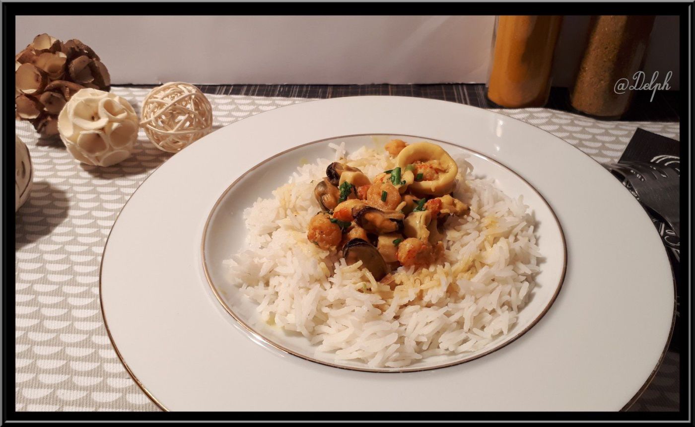 Voici une recette que j’ai piochée chez mon amie Christelle de « La cuisine de Poupoule« , Christelle a réalisé des verrines et n’a utilisé que des moules, j’ai choisi un cocktail de fruits de mer et j’ai ajouté du riz basmati pour faire un plat complet.