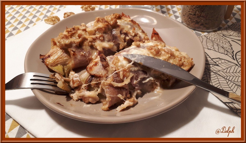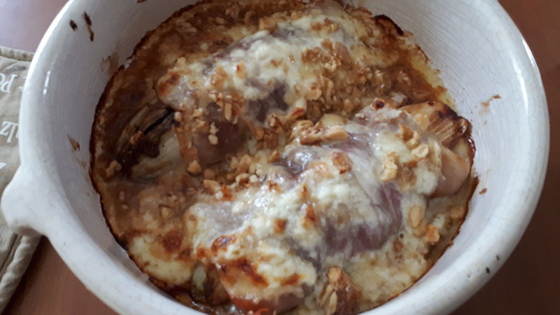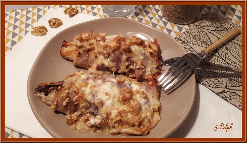 Je ne cuisine pas souvent les endives cuites car mes hommes n’aiment pas cela. Mais pendant mes vacances j’ai eu quelques jours où je mangeais seule le midi, alors j’en ai profité pour me faire ce petit plat qui d’ailleurs m’a fait deux repas car c’est assez copieux tout de même.