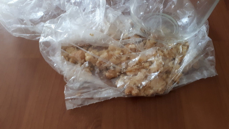 - Mettre vos noix dans un sac de congélation et les concasser grossièrement avec un rouleau ou un verre.