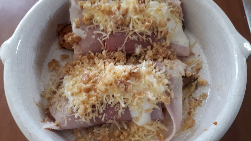 - Mettre vos endives roulées dans un plat à gratin, ajouter de la crème fraîche sur le dessus, parsemer d’un peu de Comté et de noix concassées.