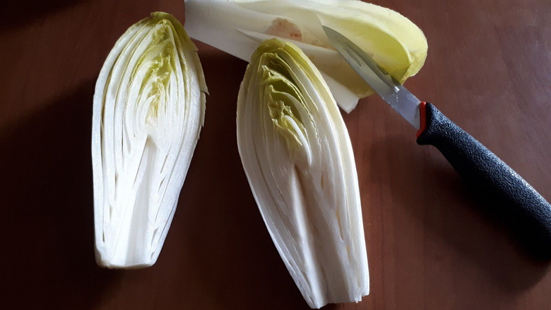 - Enlever les feuilles abîmées de l’endive, couper la base, la couper en deux et enlever le cœur.