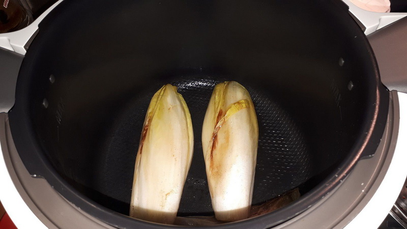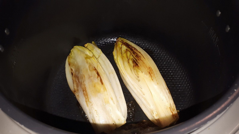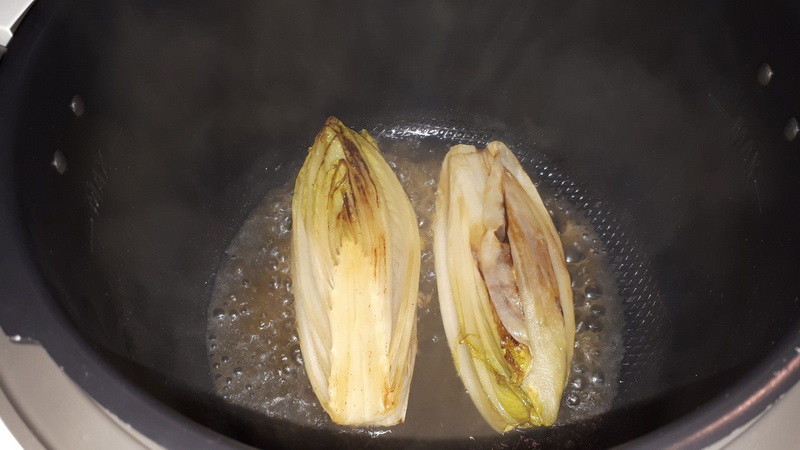 - Mettre votre Cookéo en mode dorer, déposer la noix de beurre, lorsque le beurre a fondu déposer les moitiés d’endives et laisser dorer 3 minutes en retournant délicatement régulièrement. Ajouter le miel et laisser caraméliser 3 minutes en surveillant et en retournant les endives régulièrement. Ajouter l’eau puis laisser confire jusqu’à évaporation totale de l’eau soit environ 8 minutes.