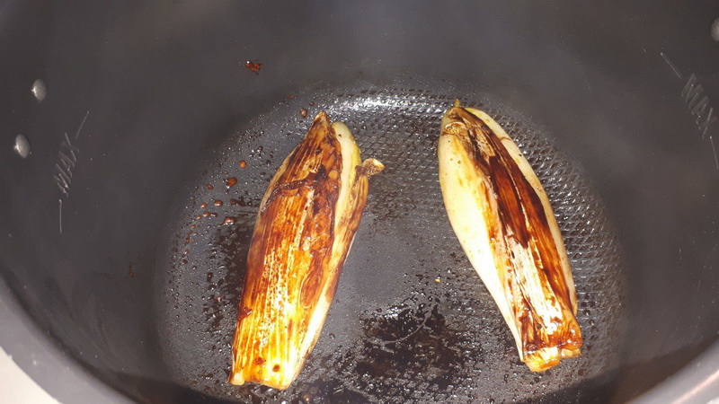- Dans une poêle, mettre une noix de beurre, ajouter vos moitiés d’endives et les faire colorer des deux côtés, les retourner délicatement, ajouter le miel, mélanger, retourner l’endive pour qu’elle caramélise puis assaisonner, ajouter l’eau et laisser confire environ 20 min (attention il faut souvent les retourner et mettre à feu moyen), jusqu’à évaporation totale de l’eau.