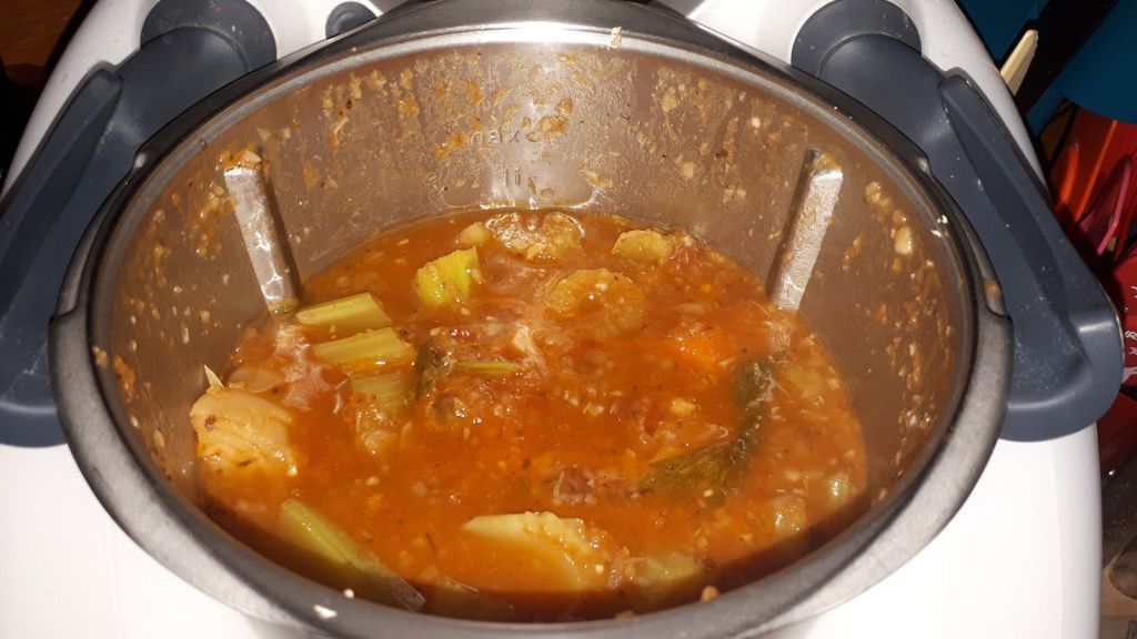 - Ajouter les carottes pelées et coupées en rondelles, la branche de céleri et coupée en rondelles, la chair de tomates, l’eau, le sel, le poivre et les herbes, faire chauffer 20min/varoma/vit mijotage.
