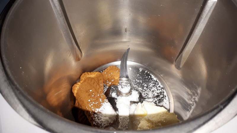 - Mettre les spéculoos, le beurre coupé en morceaux et la noix de coco puis mixer 15sec/vit5.