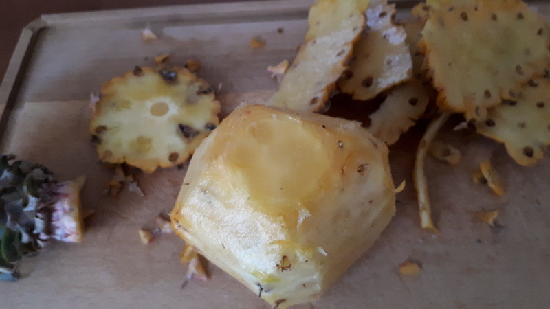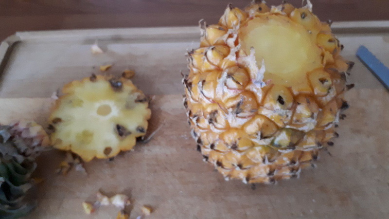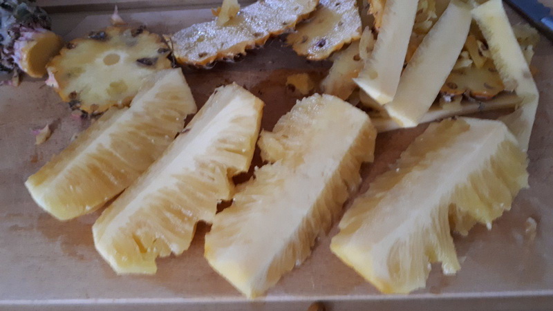- Préparer votre ananas, pour l’éplucher, il faudra couper les deux extrémités, puis avec un bon couteau à dents, enlever la peau à ras. Enlever les petits yeux avec un autre couteau pointu. Couper en quartiers et enlever le cœur. Couper l’ananas en petits dés.