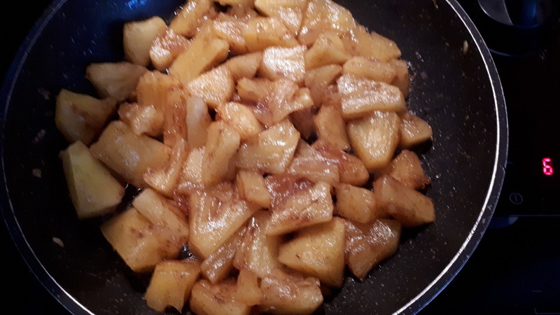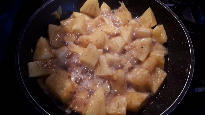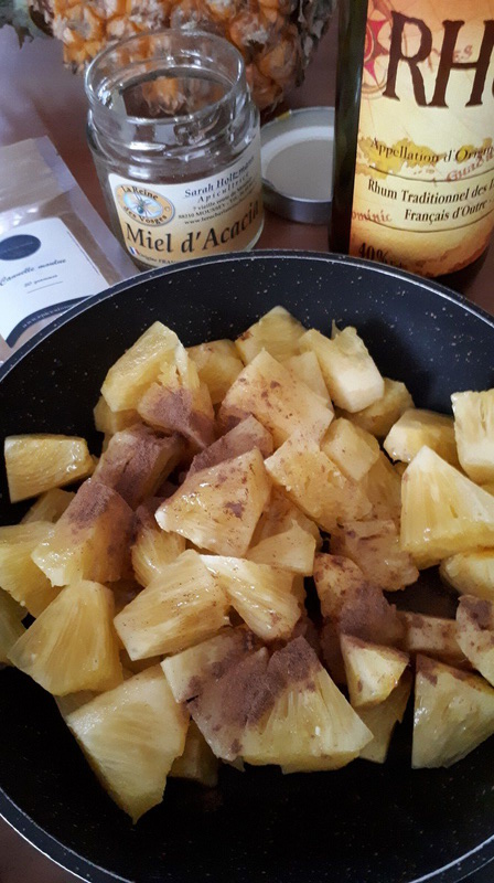 - Dans un poêle, mettre les dés d’ananas, le miel, la cannelle et le rhum, laisser cuire une dizaine de minutes en mélangeant régulièrement jusqu’à ce que le jus soit évaporé et l’ananas bien fondant.