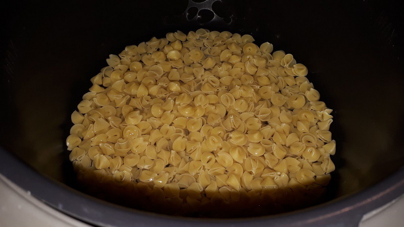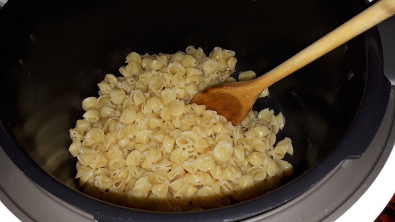 - Mettre vos pâtes dans la cuve, recouvrir d’eau et mettre sous pression 2 minutes, (il faut prendre la moitié du temps indiqué sur le paquet selon les pâtes utilisées). Lorsqu’elles sont cuites les égoutter et les réserver.