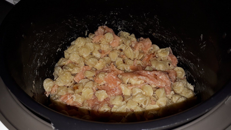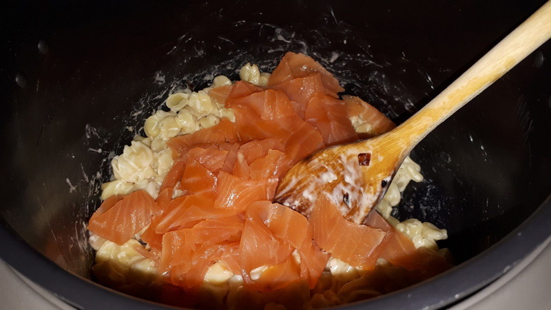 - Lorsque l’échalote est dorée, remettre les pâtes, puis le mélange de crème et le saumon coupé en lanières, mélanger, éteindre votre Cookéo, rabattre le couvercle sans le fermer, laisser 2 minutes.