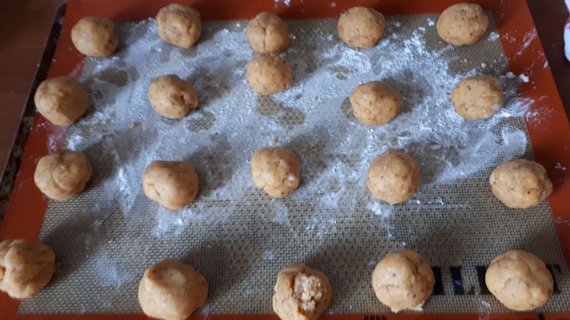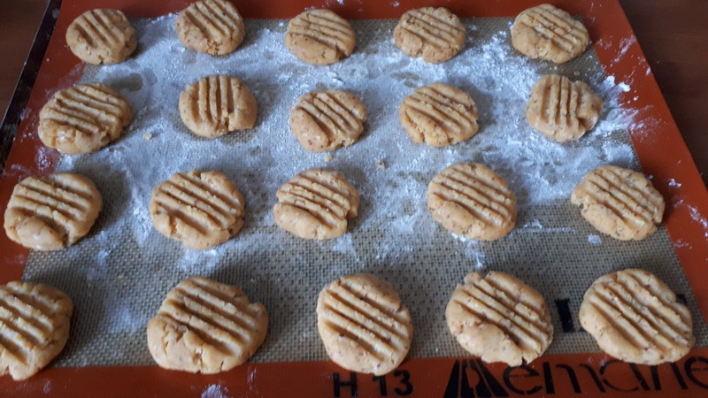 - Préchauffer le four à 180°C. Détailler la pâte en 20 petites boules. Les placer sur la plaque du four recouverte de papier sulfurisé et écraser chaque boule avec une fourchette.