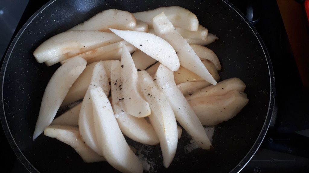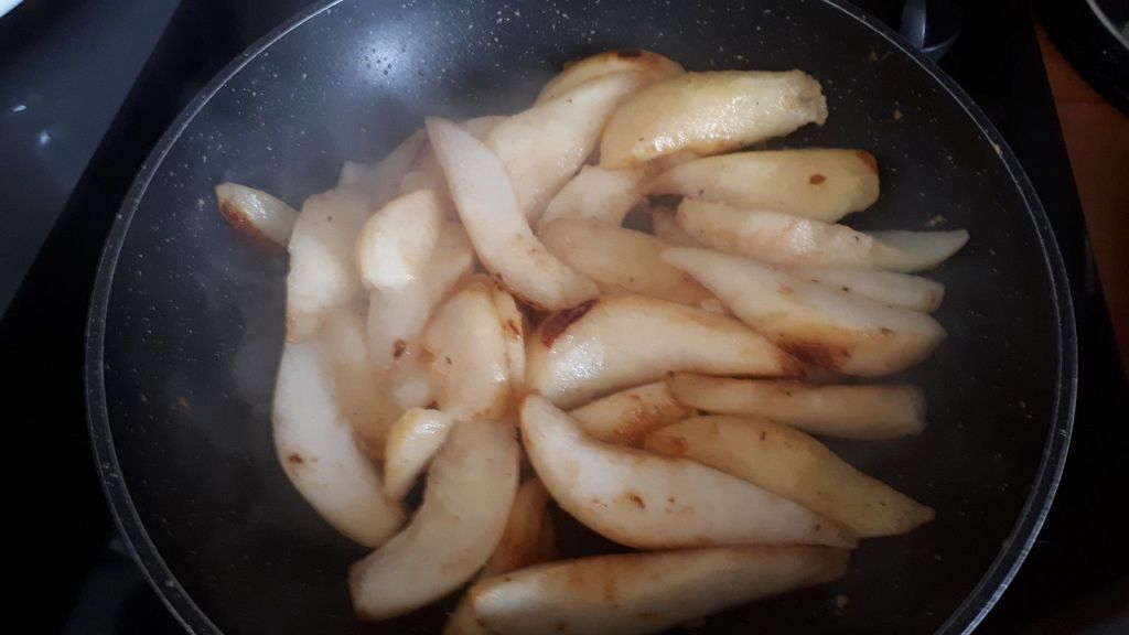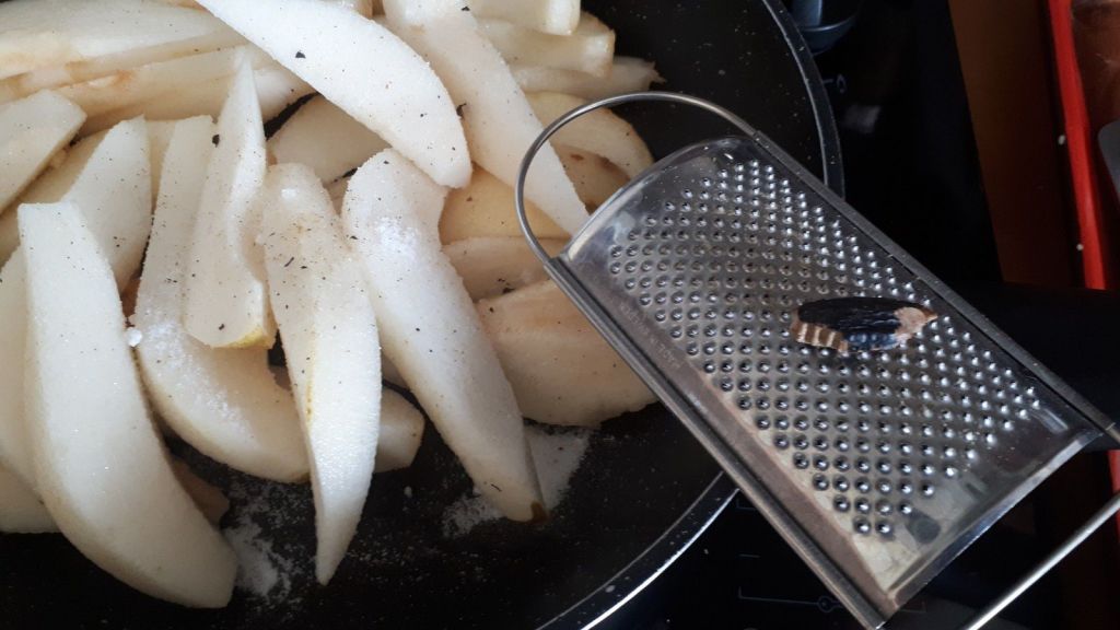 - Préparer les poires, les éplucher, et les couper en lamelles, les faire revenir dans une poêle anti-adhésive avec le sucre vanillé et un peu de fève tonka râpée. Laisser refroidir.