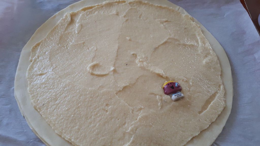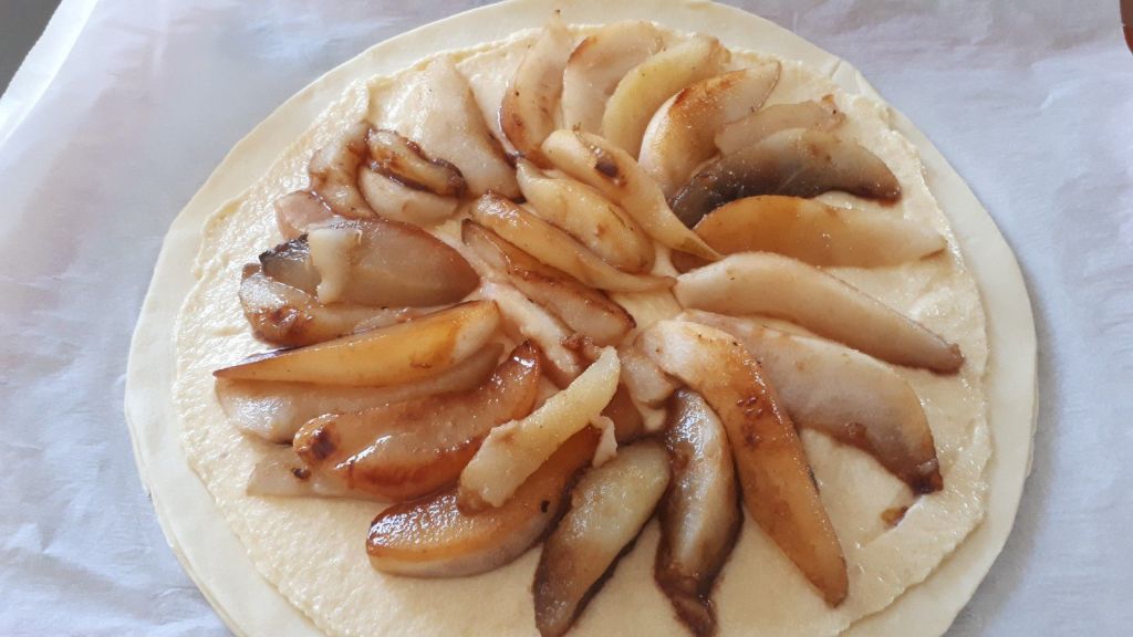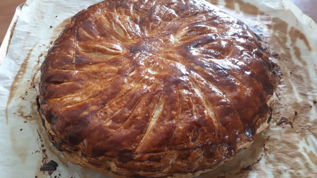 - Tapisser le milieu et jusqu’à 1 cm du bord de crème d’amande mettre la fève puis déposer par dessus les poires refroidies. Poser la deuxième pâte dessus, fermer bien le bord. Dorer la pâte avec le jaune d’œuf battu et faire un joli dessin sur le dessus et enfourner pour environ 35 minutes.
