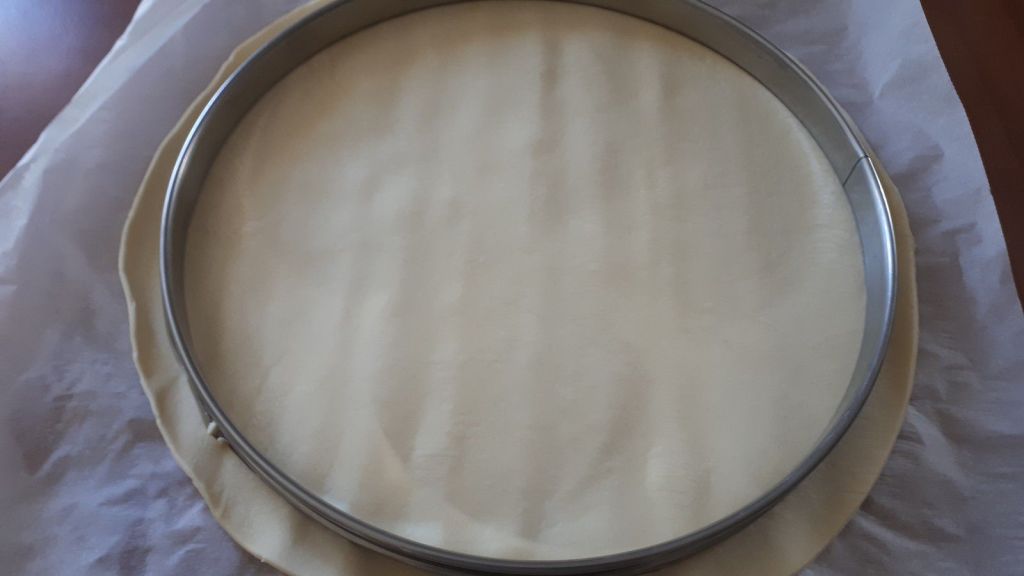 - Étaler une pâte feuilletée, pour qu’elle soit un peu plus feuilletée, je découpe un bord à l’aide d’un cercle que je dépose au bord ( voir photo, cela fait trois épaisseurs de pâte) mouiller le tour avec un peu d’eau.