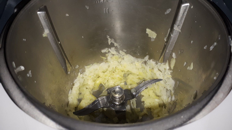 - Éplucher et couper les oignons en deux, les mettre dans le bol et mixer 5sec/vit5, ajouter l’huile et faire revenir 3min/varoma/Vit mijotage.