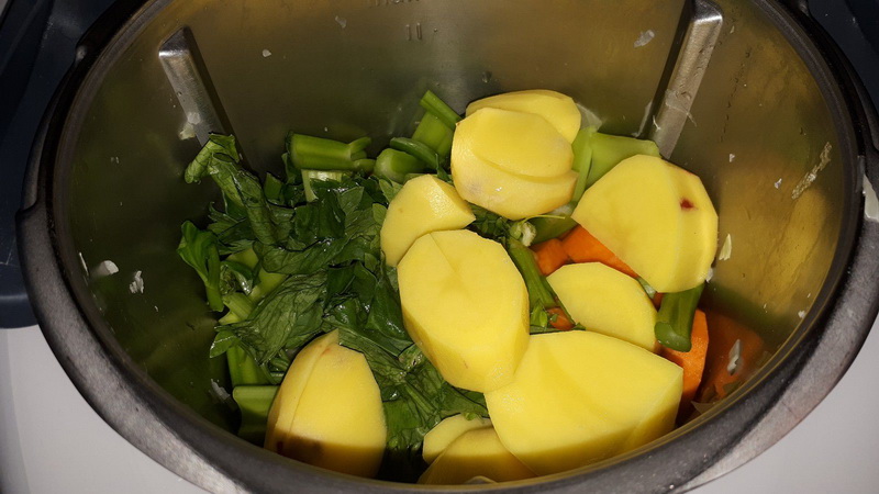 - Ajouter les carottes pelées, lavées et coupées en rondelles, les pommes de terre épluchées, lavées et coupées en morceaux, les branche de céleri nettoyées et coupées en petits tronçons, continuer de faire suer 4min/varoma/Vit mijotage.
