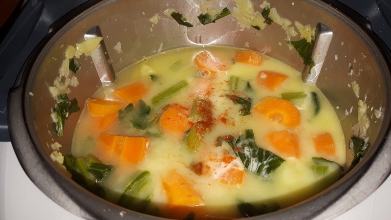 - Ajouter l’eau, assaisonner avec le sel et le poivre puis faire chauffer 18min/varoma/vi mijotage. A la sonnerie ajouter le lait concentré non sucré, une pincée de paprika ( ou plus selon les gouts) puis mixer 30sec/vit 6 à 9. Si vous souhaitez un velouté plus liquide ajouter un peu de bouillon de légumes.