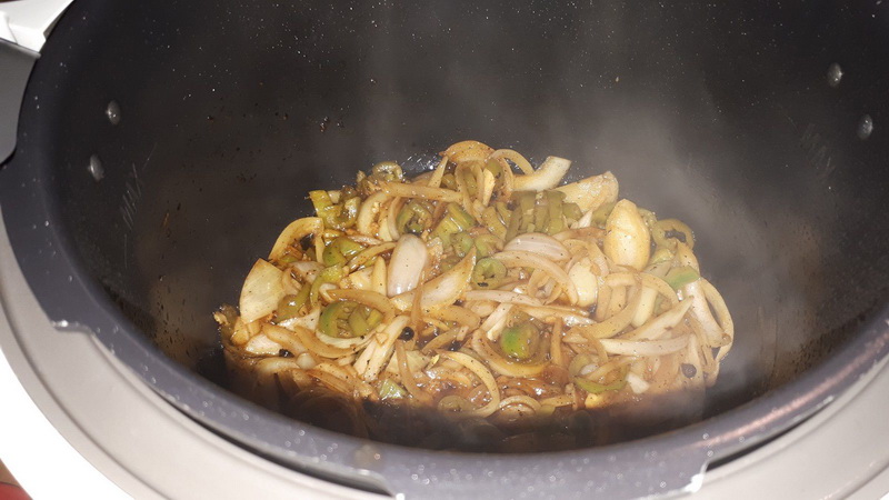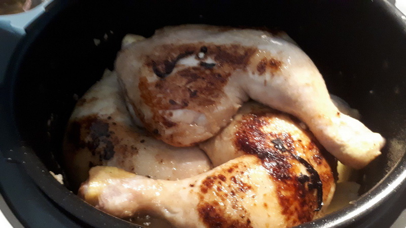 - Mettre l’huile dans la cuve et mettre en mode dorer, ajouter les cuisses de poulet et les faire dorer 3 minutes de chaque côté. Le sortir et réserver