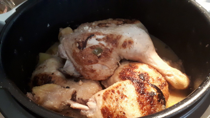 - Verser le reste de marinade, ajouter un peu de bouillon de volaille ( le reste de marinade et le bouillon doivent faire environ 25cl de liquide) dans la cuve, ajouter le poulet, et mettre en mode sous pression 20 minutes.
