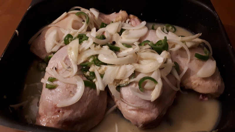 - Mélanger le poulet, les oignons, les piments, le sel, le poivre, l’ail la moutarde et le jus de citron dans un grand saladier. Couvrir et laisser mariner pendant une nuit.