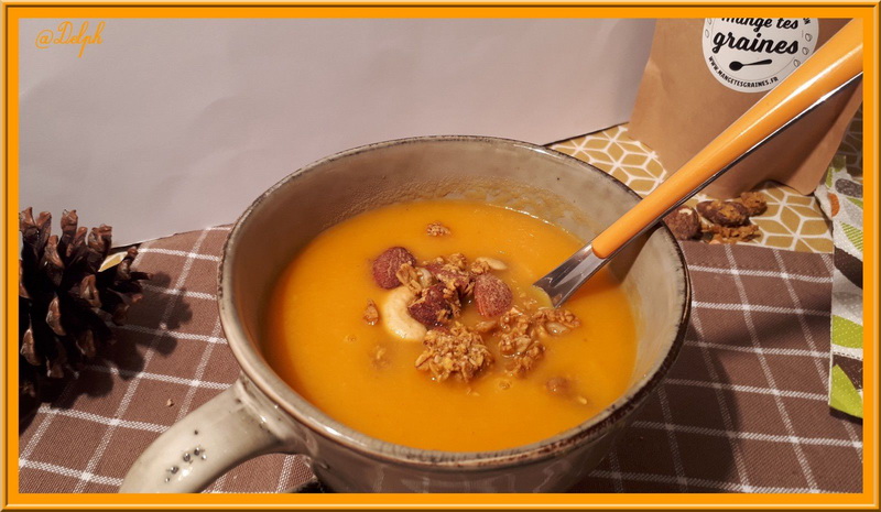 Vous pouvez parsemer un peu de coriandre fraîche, j’ai préféré parsemer un peu de mon granola salé de « Mange tes graines » au goût carotte coriandre.