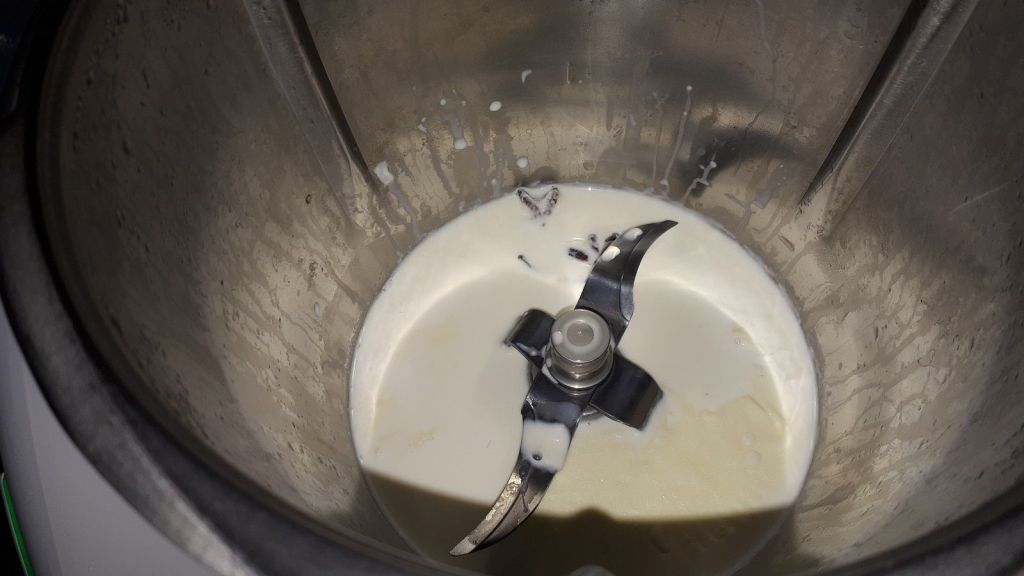 - Verser la crème liquide dans le bol, ajouter la cannelle et la badiane. Porter à ébullition 2min30/100°C/vit mijotage. Laisser infuser dans le bol environ 30 minutes.