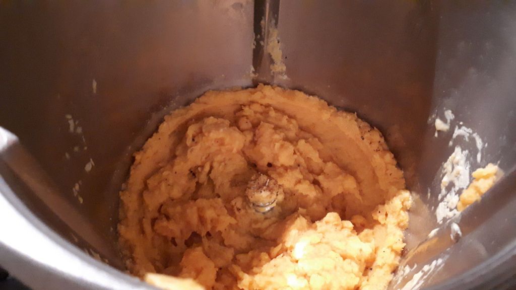 - Au bout des trente minutes enlever la badiane et la cannelle ajouter les patates douces puis programmer 20min/100°C/Vit 1, ( si vos patates ne sont pas assez cuites ajouter 2 minutes de cuisson, selon la grosseur de vos morceaux cela peut être un peu plus long) à la sonnerie, ajouter la muscade, saler et poivrer mixer 20sec/vit 3, puis 10sec/vit3.