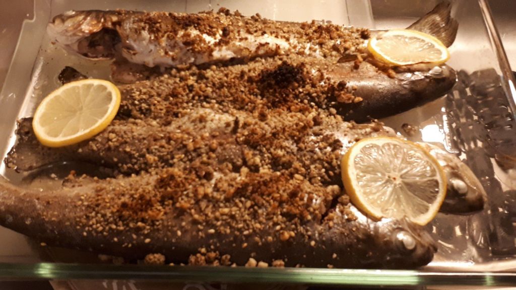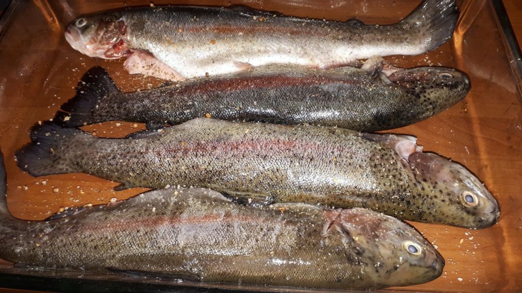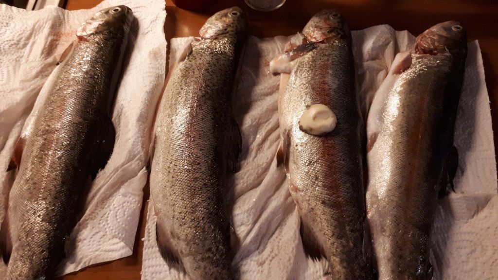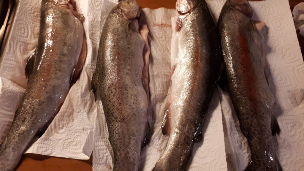 - Verser l’huile sur les poissons et cuire 10-12 minutes ( à surveiller selon la grosseur des truites). La peau des poissons doit être brunes.