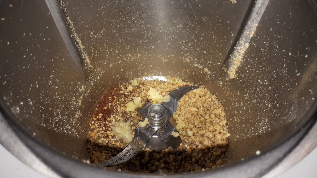 - Pour obtenir votre poudre de noix, mixer vos cerneaux de noix avec un bon mixeur, pour moi au Thermomix 20sec/vit5, ajouter l’ail hachée et 1 c à s bombée de sumac, mélanger le tout avec le mixeur ou au Thermomix 20sec/vit3.