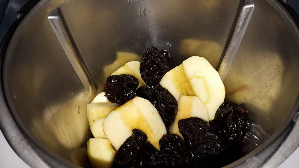 - Peler et épépiner les pommes, les couper en quartiers, les mettre dans le bol avec les pruneaux, mixer 5sec/vit6.