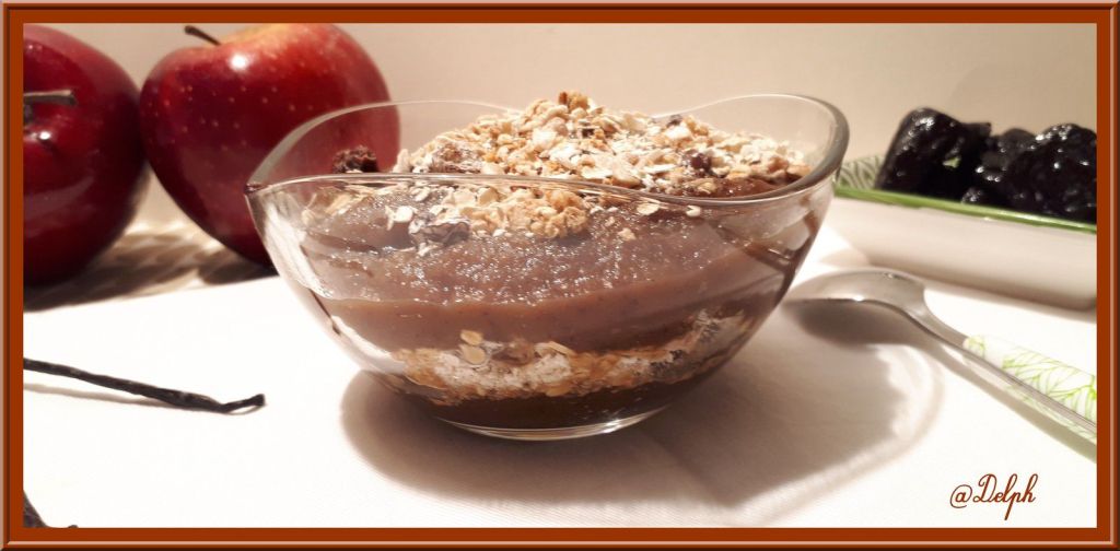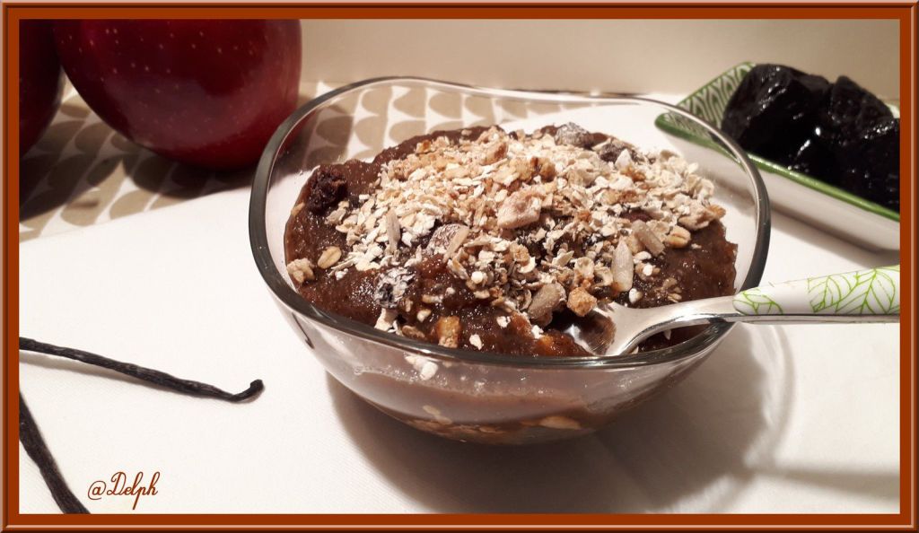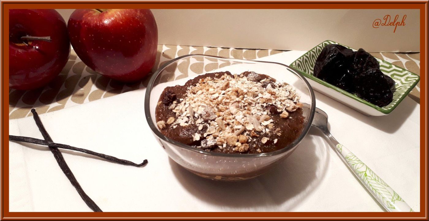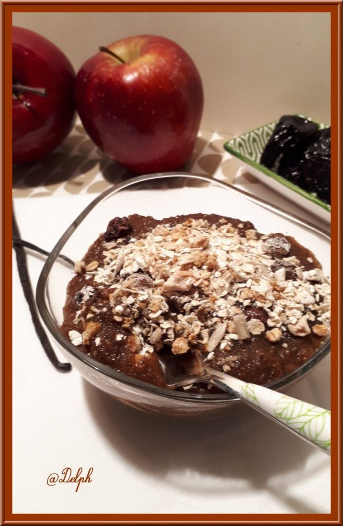 Pour mon petit déjeuner je prends régulièrement de la compote que j’associe à des flocons d’avoine, je me régale et cela me cale bien jusqu’au repas. Voici la recette que j’ai testée chez ma chère Isabelle de « Quelques grammes de gourmandise »