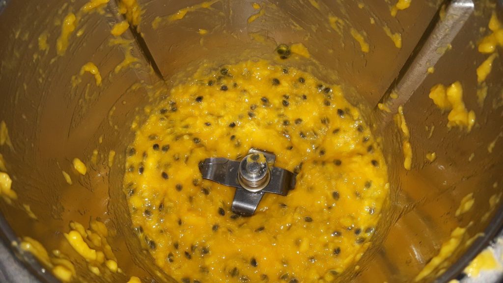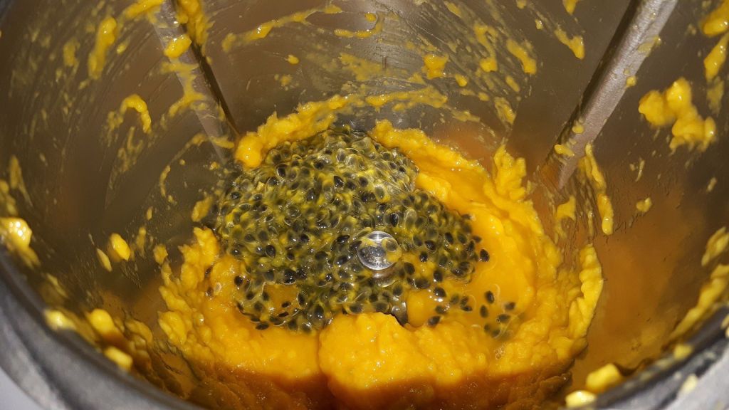 - Éplucher votre mangue, la couper en morceaux et la mixer , ajouter les grains de fruits de la passion réservés et mixer à nouveau mais pas trop fort pour ne pas briser les grains en morceaux.