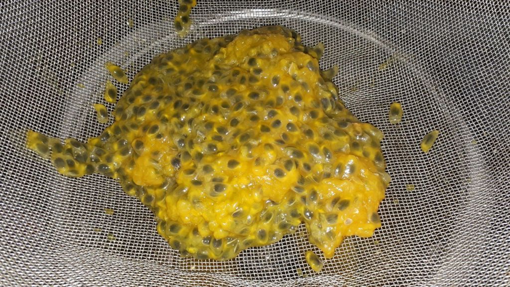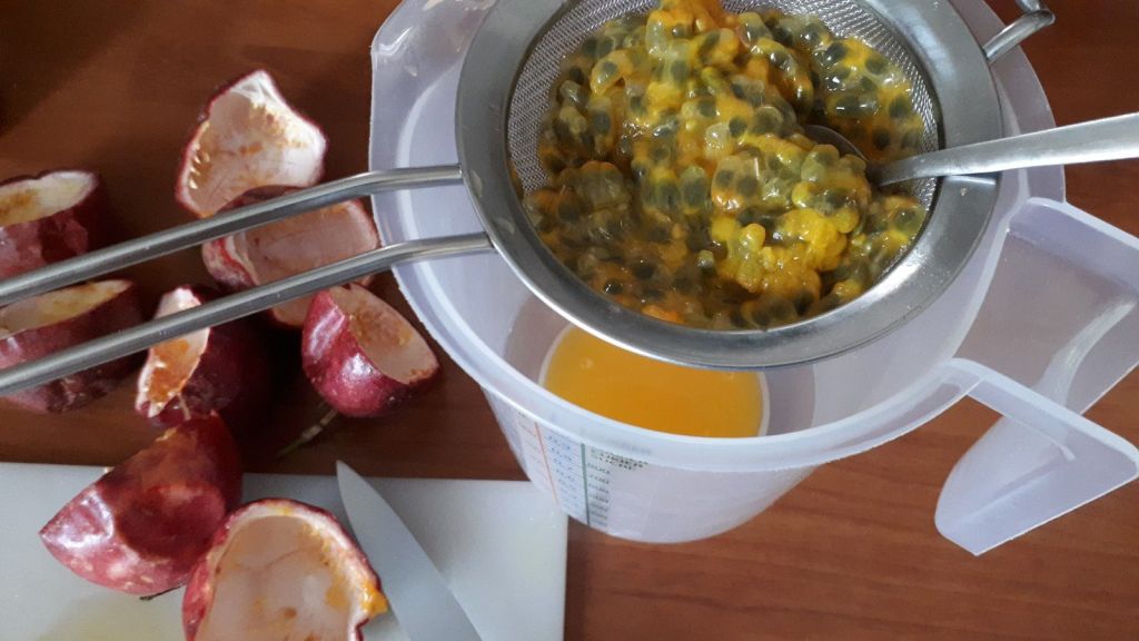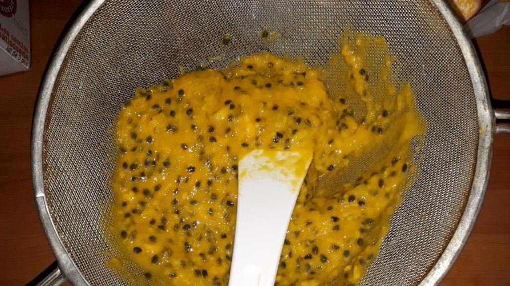 - Couper les fruits de la passion en deux, et les presser au dessus d’un saladier à l’aide d’une passoire pour en extraire le jus. Mettre de côté les graines restantes.