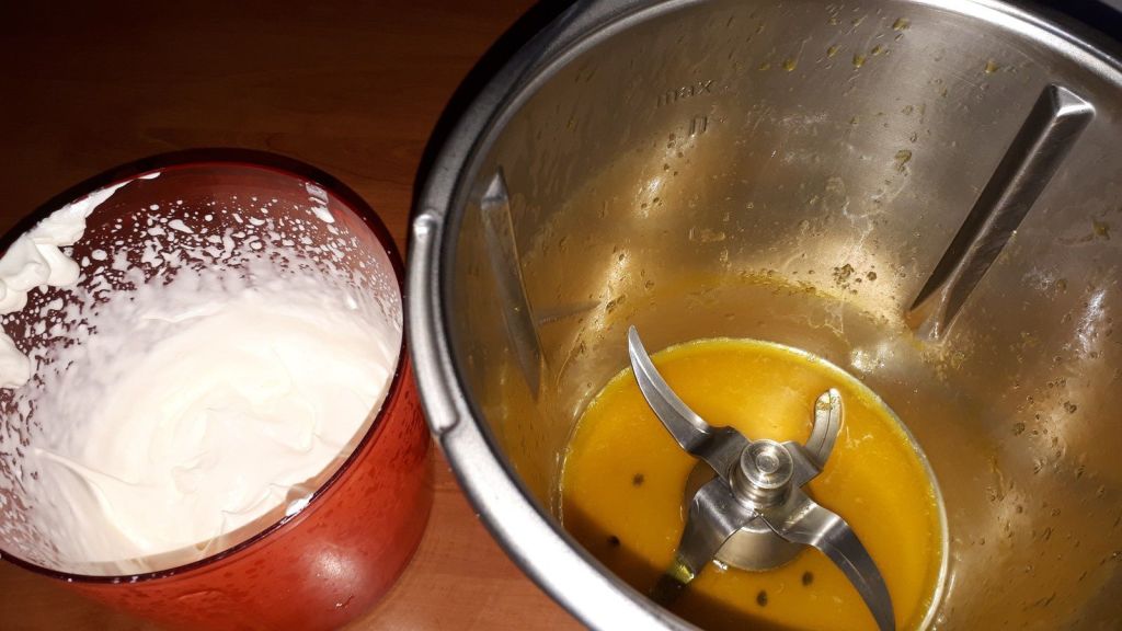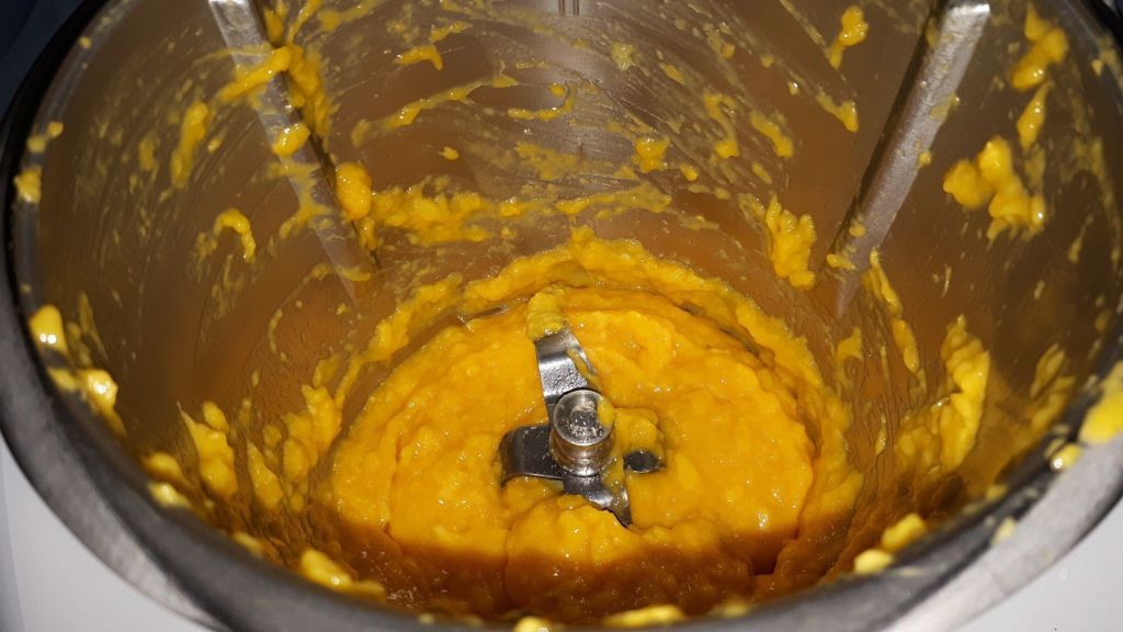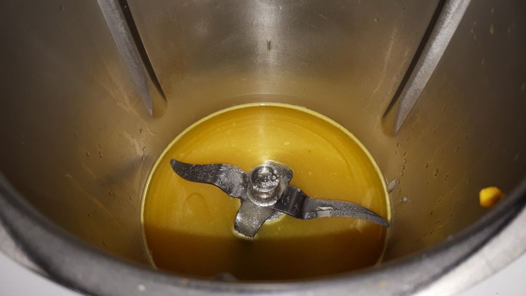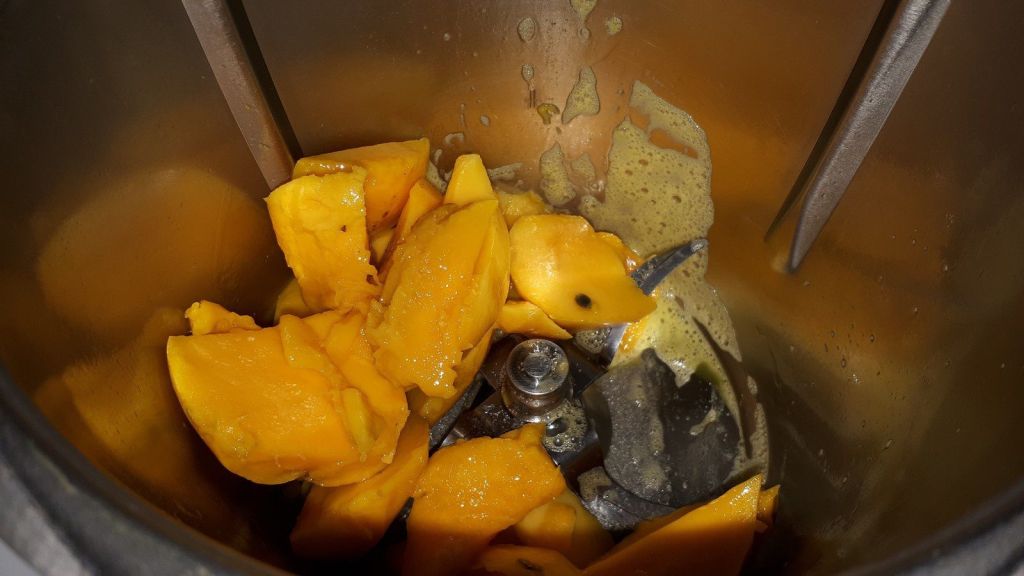 - Éplucher votre mangue, la couper en morceaux et la déposer dans le bol du Thermomix, mixer 10sec/vit5, ajouter les grains de fruits de la passion de la première étape puis mixer 10sec/vit3.